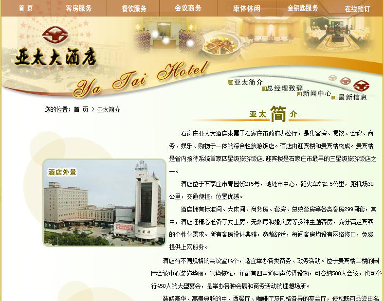 石家莊亞太大酒店隸屬于石家莊市政府辦公廳,是集客房、餐飲、會議、商務(wù)、娛樂、購物于一體的綜合性旅游飯店。酒店由迎賓樓和貴賓樓構(gòu)成。貴賓樓是省內(nèi)接待系統(tǒng)首家四星級旅游飯店,迎賓樓是石家莊市最早的三星級旅游飯店之一。